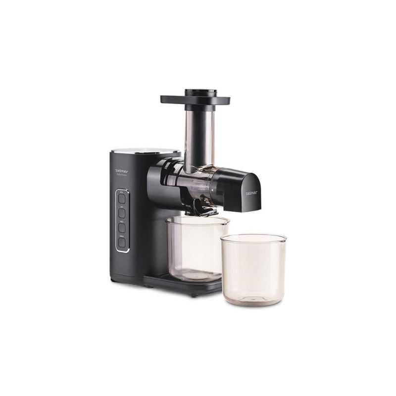 Wyciskarka wolnoobrotowa do warzyw i owoców o mocy silnika 150 W, 2 prędkości obrotów 65 i 80 na minutę, funkcja cofania, system szybkie wstępnego mycia, technologia estrakcji bezfiltrowej, nózki antypoślizgowe, pojemnik na sok i odpady w zestawie.